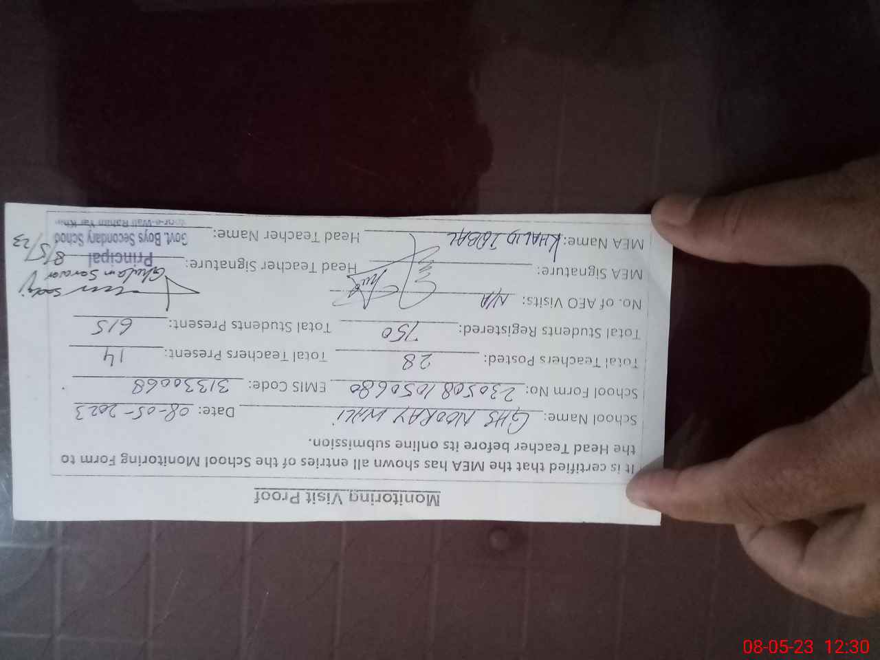 | Remarks (Use Separate Page if Required): Class verification is not updated on mea tab as per sis and eleven teachers are on census duty and one teacher is on temprery deployed in CEO office and two teachers are on leave and two classes are sitting in veranda | |||||