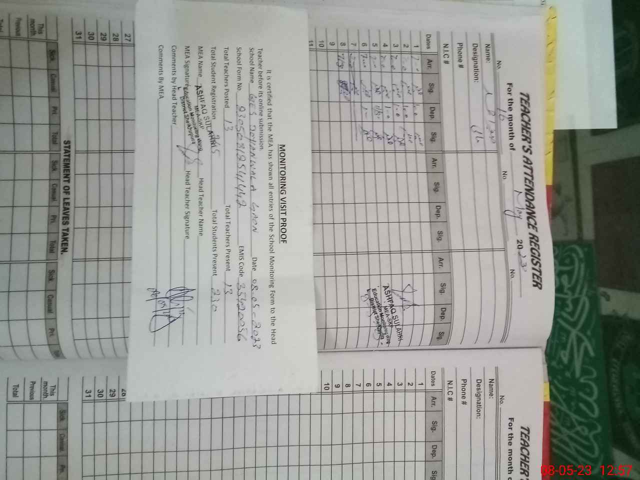 | Attendance Register | Head Teacher | MEA with School | Visit Proof |