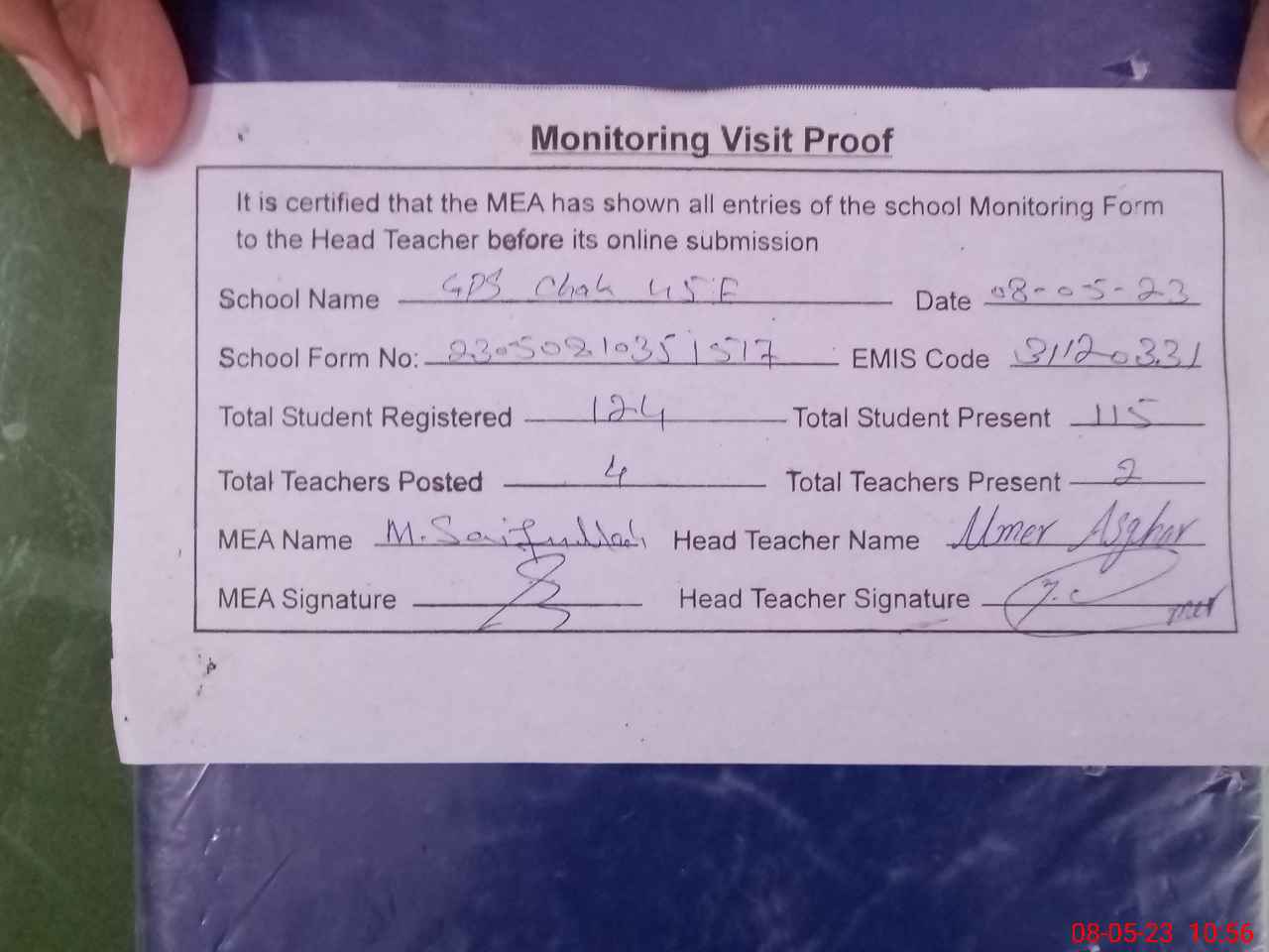 | Attendance Register | Head Teacher | MEA with School | Visit Proof |