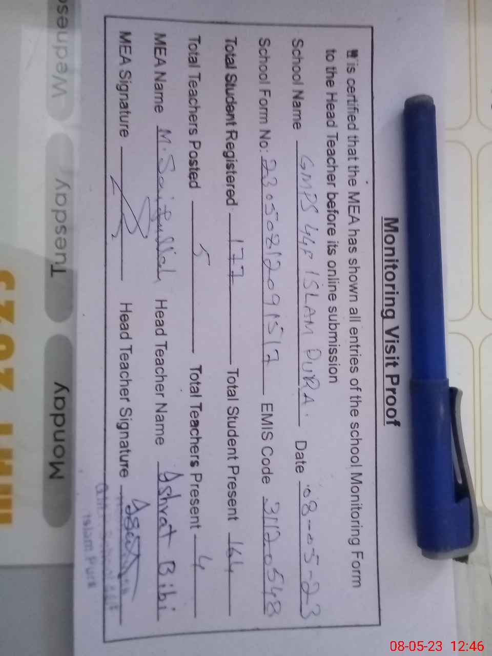 | Attendance Register | Head Teacher | MEA with School | Visit Proof |