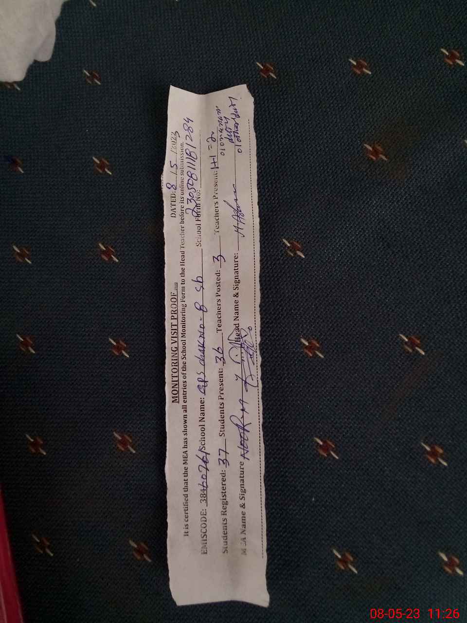 | Attendance Register | Head Teacher | MEA with School | Visit Proof |