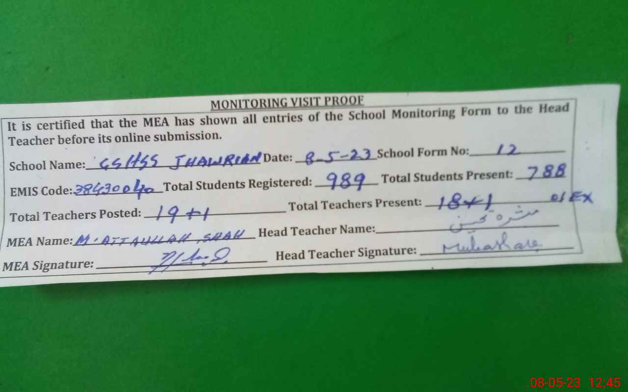 | Attendance Register | Head Teacher | MEA with School | Visit Proof |