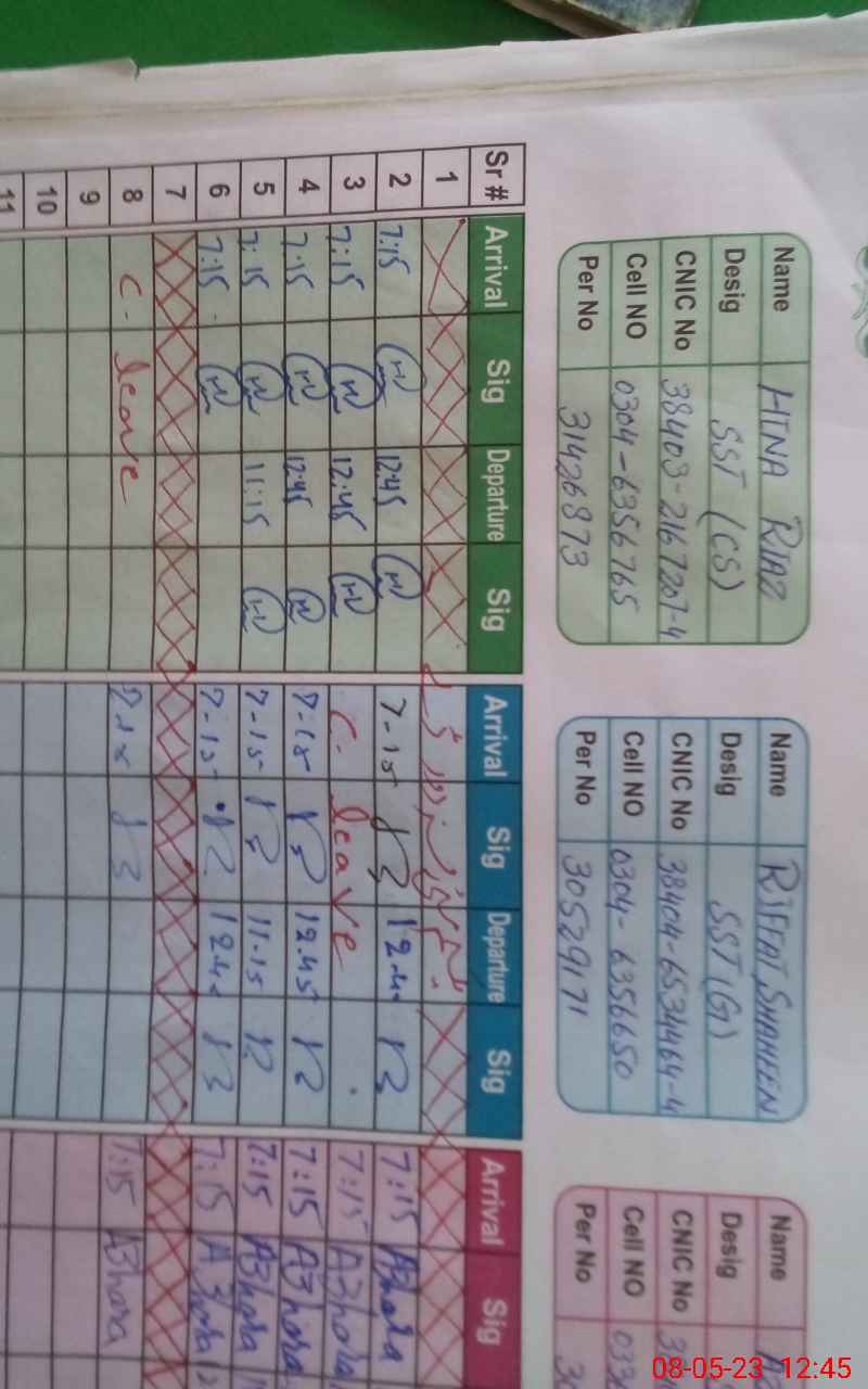 | CNIC | Full Name | Designation | R/C | Absence During Last Calender Month |