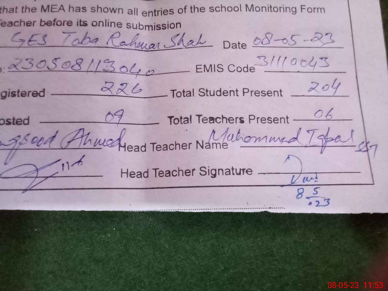 | Attendance Register | Head Teacher | MEA with School | Visit Proof |