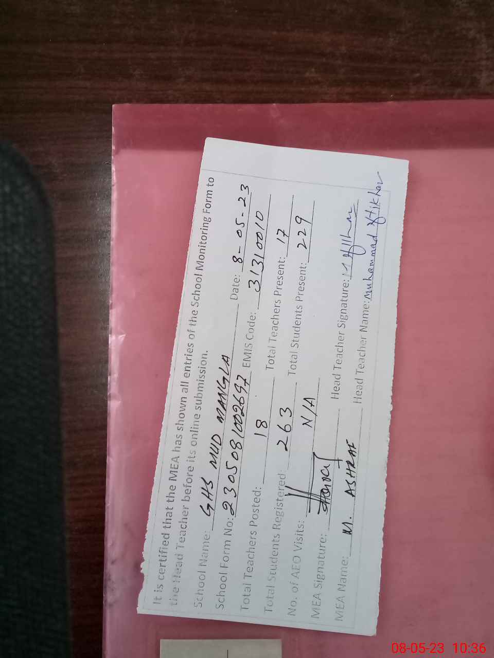 | Attendance Register | Head Teacher | MEA with School | Visit Proof |