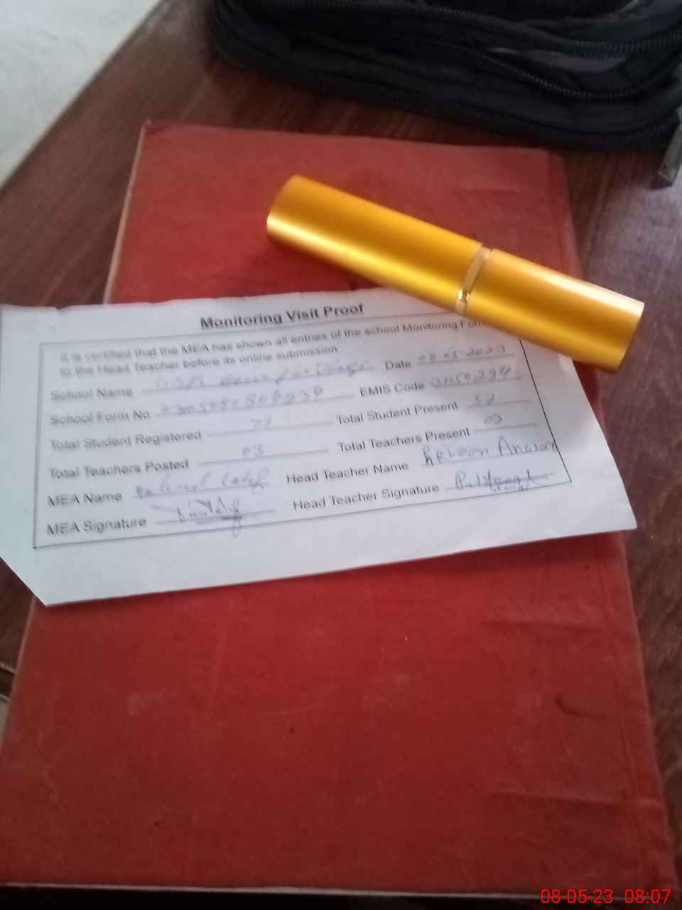 | Attendance Register | Head Teacher | MEA with School | Visit Proof |