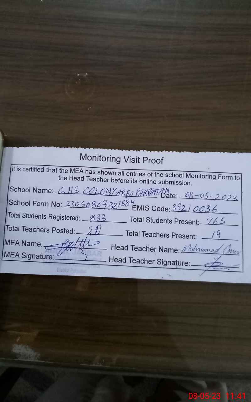 | EMIS Code: 39210036 | Name of School: GHS COLONY AREA PAKPATTAN | |||