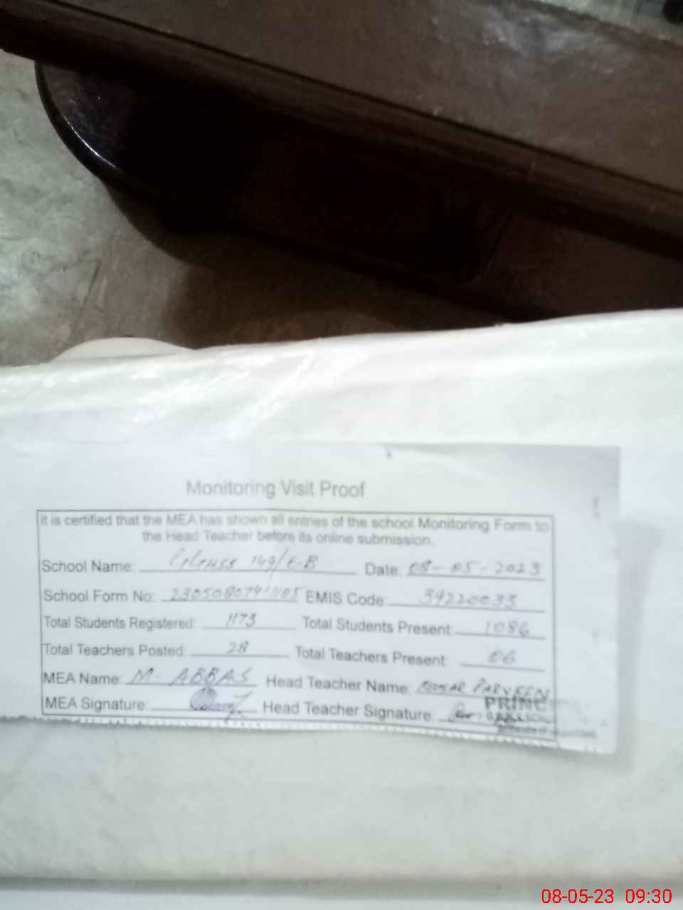 | Attendance Register | Head Teacher | MEA with School | Visit Proof |