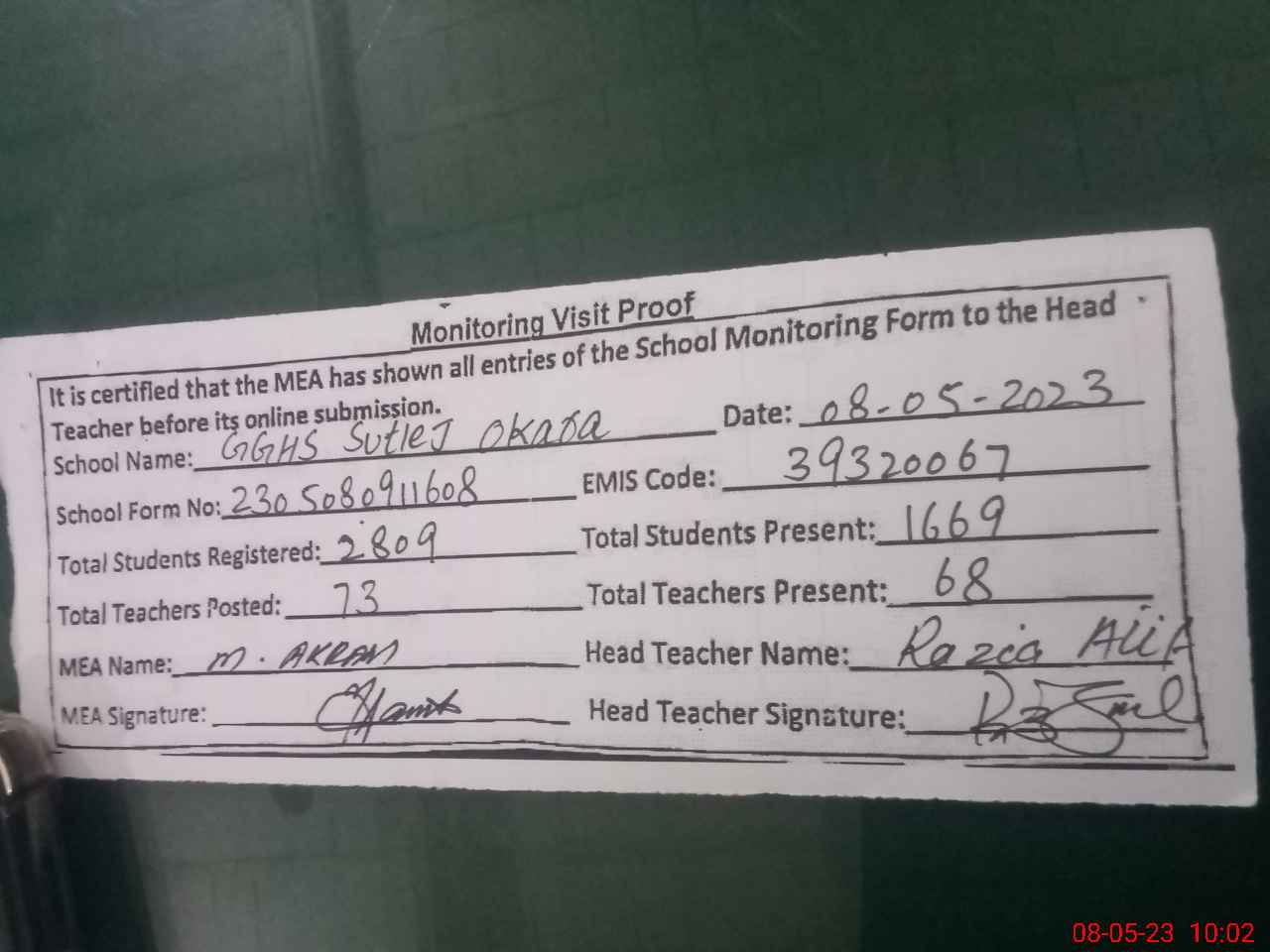| EMIS Code: 39320067 | Name of School: GGHS SUTLUJ OKARA | |||