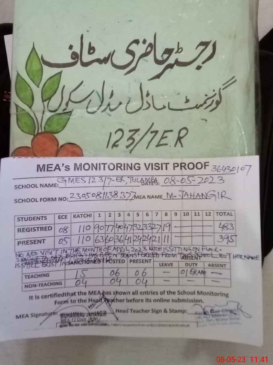 | Attendance Register | Head Teacher | MEA with School | Visit Proof |