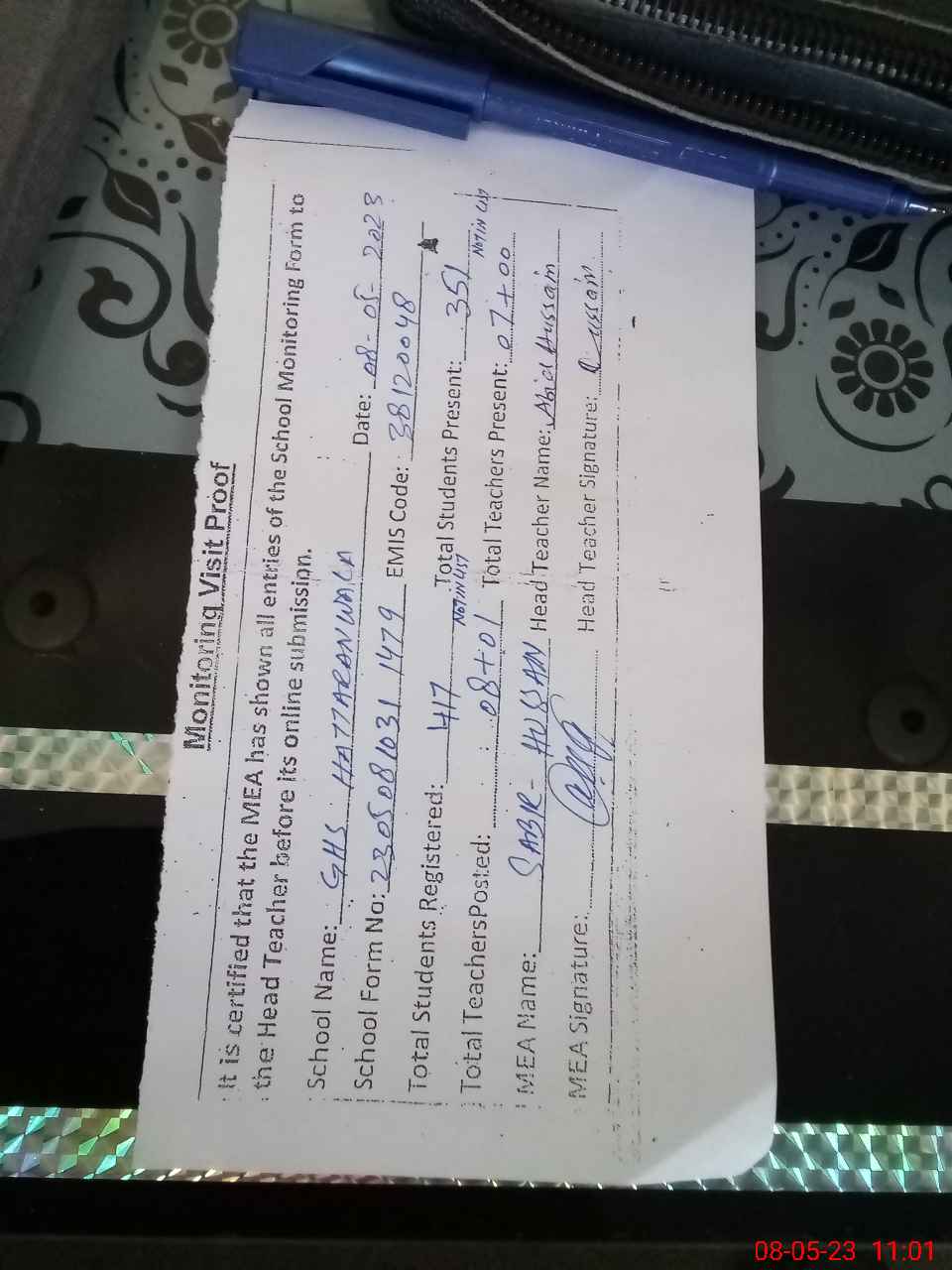| Attendance Register | Head Teacher | MEA with School | Visit Proof |