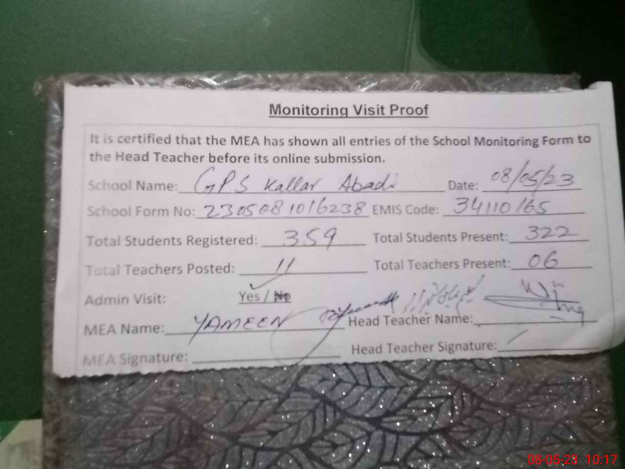 | Attendance Register | Head Teacher | MEA with School | Visit Proof |