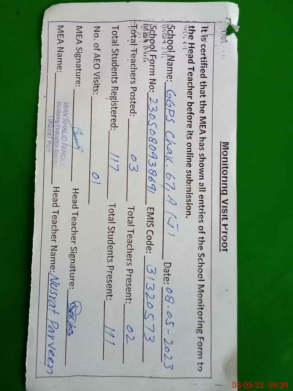 | Attendance Register | Head Teacher | MEA with School | Visit Proof |