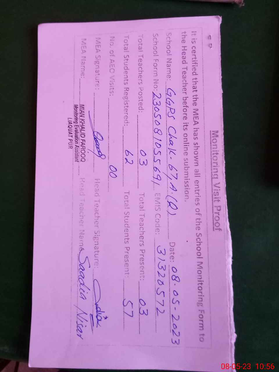 | Attendance Register | Head Teacher | MEA with School | Visit Proof |