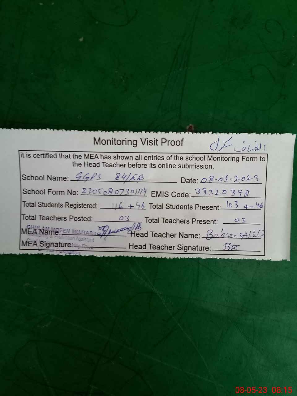 | Monitoring Date: 08-05-2023 | Start Time: 08-05-2023 07:30 AM | End Time: 08-05-2023 08:15 AM | Name of MEA: Gh**** Mu**** Mu**** (R**** | |