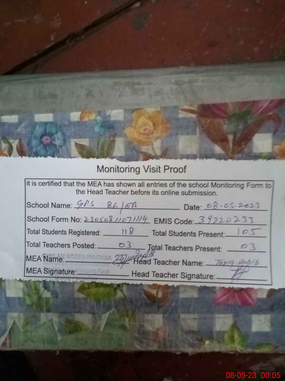 | Attendance Register | Head Teacher | MEA with School | Visit Proof |