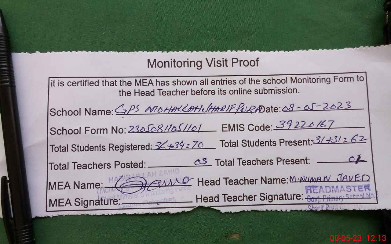 | EMIS Code: 39220167 | Name of School: GPS MOHALLA SHARIF PURA | |||