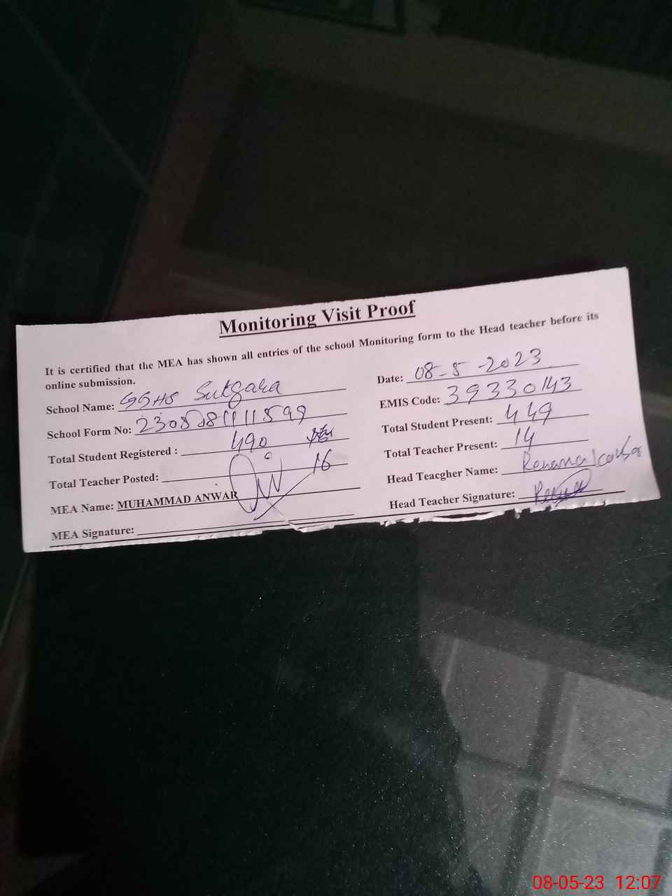 | Attendance Register | Head Teacher | MEA with School | Visit Proof |