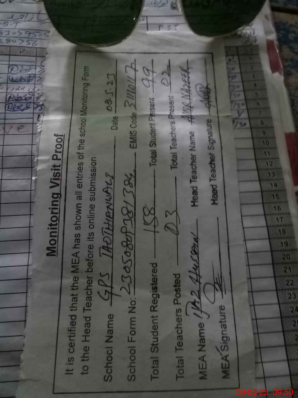 | Attendance Register | Head Teacher | MEA with School | Visit Proof |