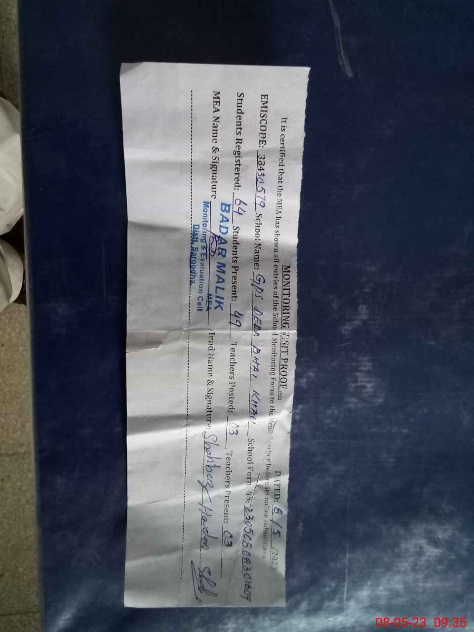 | Attendance Register | Head Teacher | MEA with School | Visit Proof |