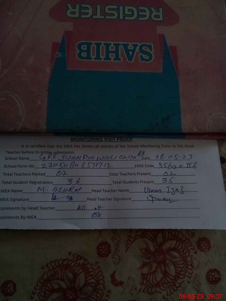 | Attendance Register | Head Teacher | MEA with School | Visit Proof |