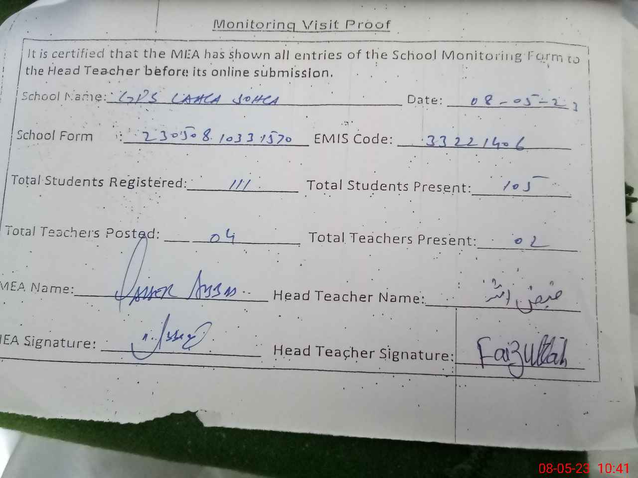 | Attendance Register | Head Teacher | MEA with School | Visit Proof |
