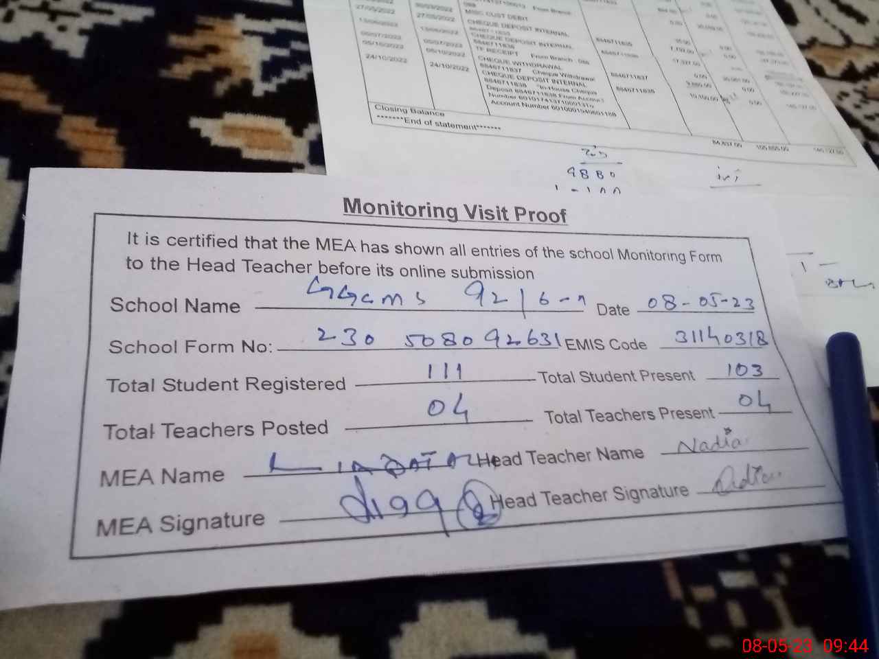 | Attendance Register | Head Teacher | MEA with School | Visit Proof |