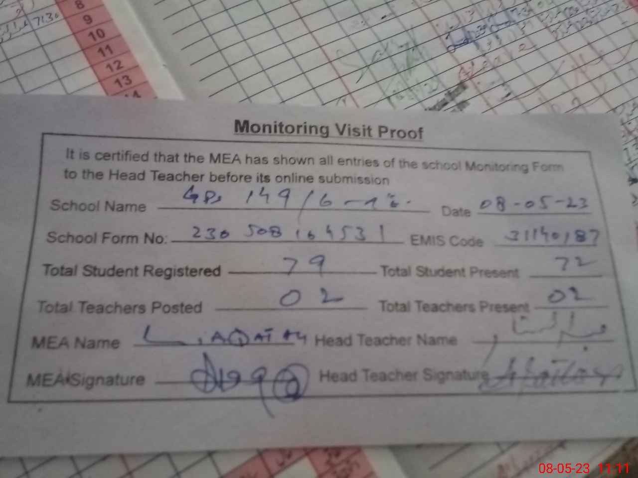 | Attendance Register | Head Teacher | MEA with School | Visit Proof |