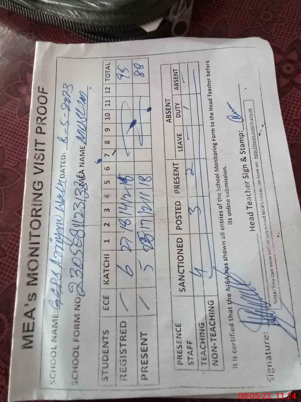 | Attendance Register | Head Teacher | MEA with School | Visit Proof |