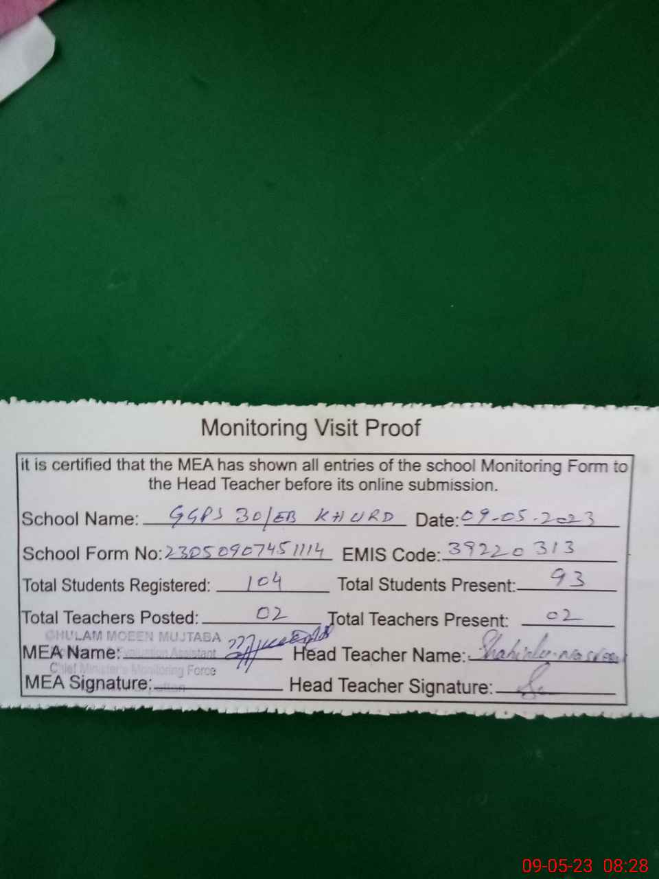 | Monitoring Date: 09-05-2023 | Start Time: 09-05-2023 07:45 AM | End Time: 09-05-2023 08:28 AM | Name of MEA: Gh**** Mu**** Mu**** (R**** | |