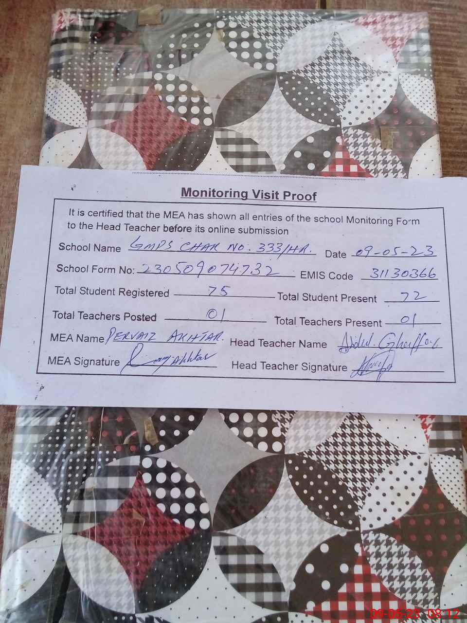 | Attendance Register | Head Teacher | MEA with School | Visit Proof |