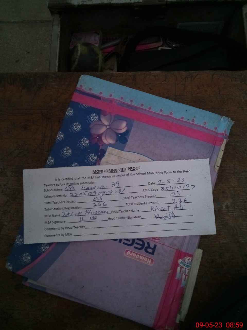 | Attendance Register | Head Teacher | MEA with School | Visit Proof |