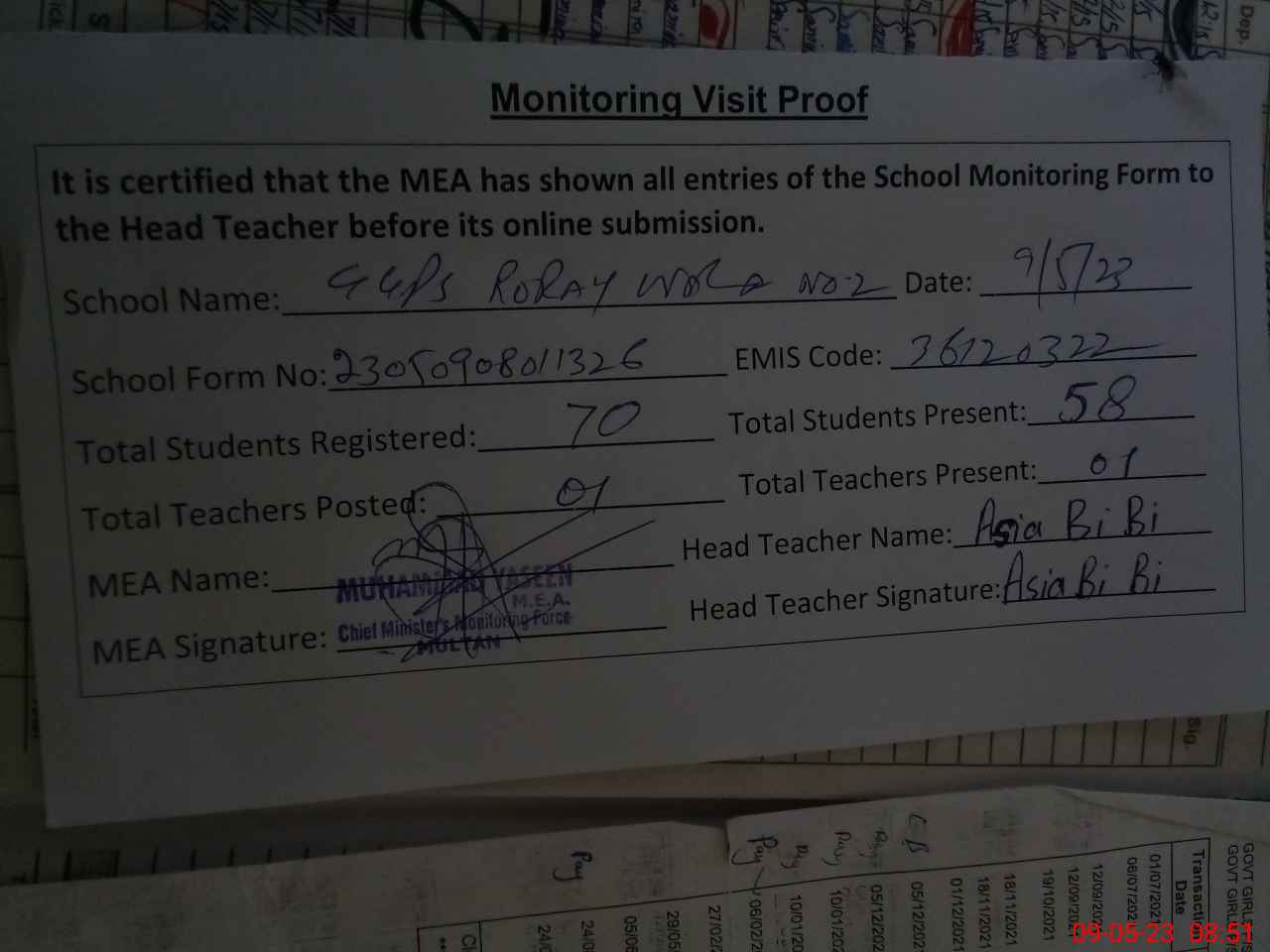 | Attendance Register | Head Teacher | MEA with School | Visit Proof |