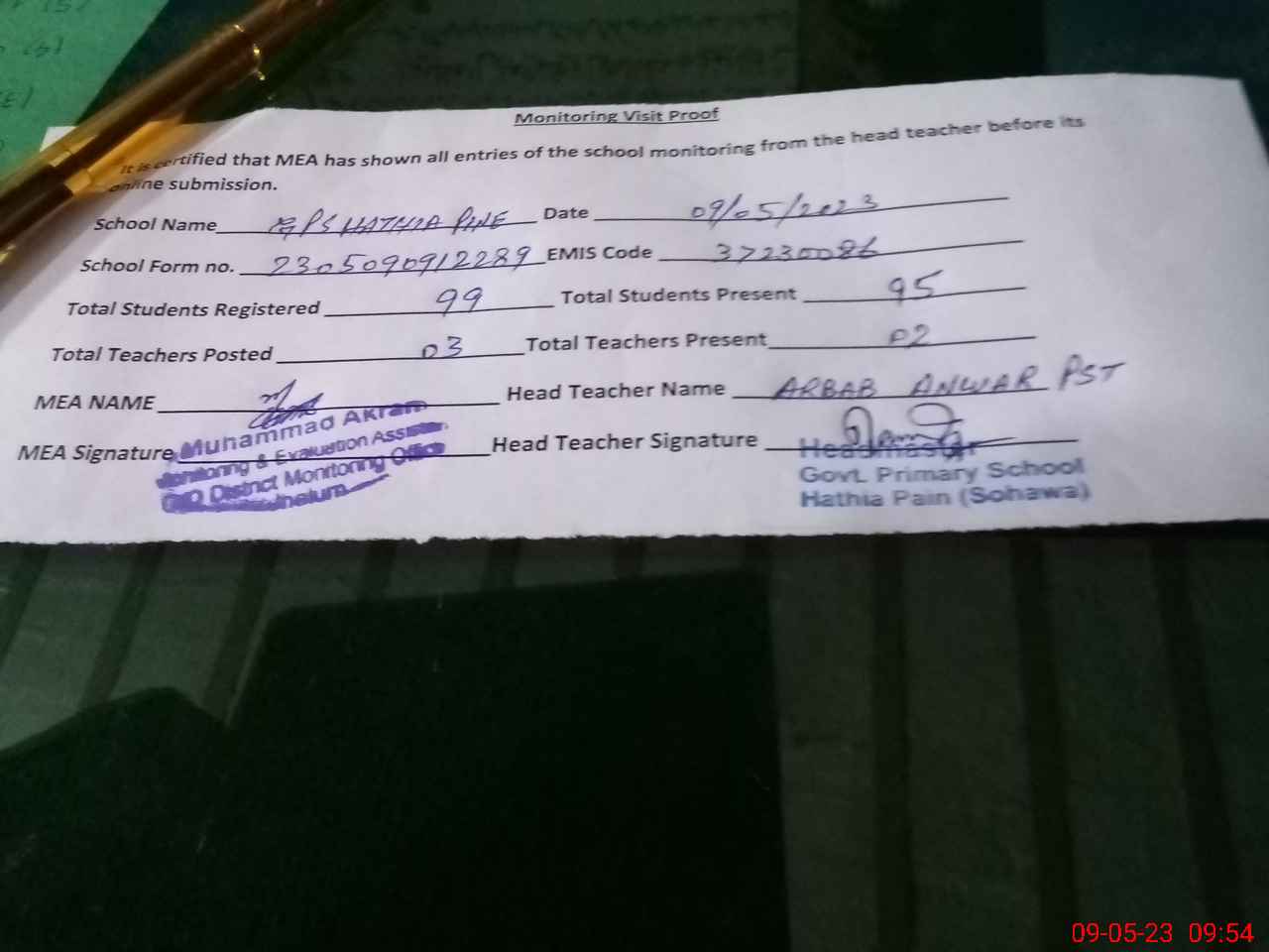 | Attendance Register | Head Teacher | MEA with School | Visit Proof |