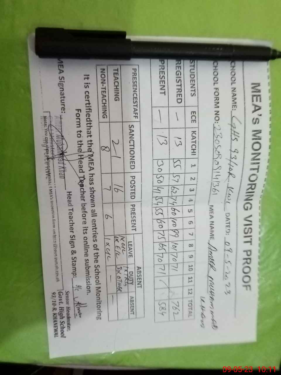 | Attendance Register | Head Teacher | MEA with School | Visit Proof |