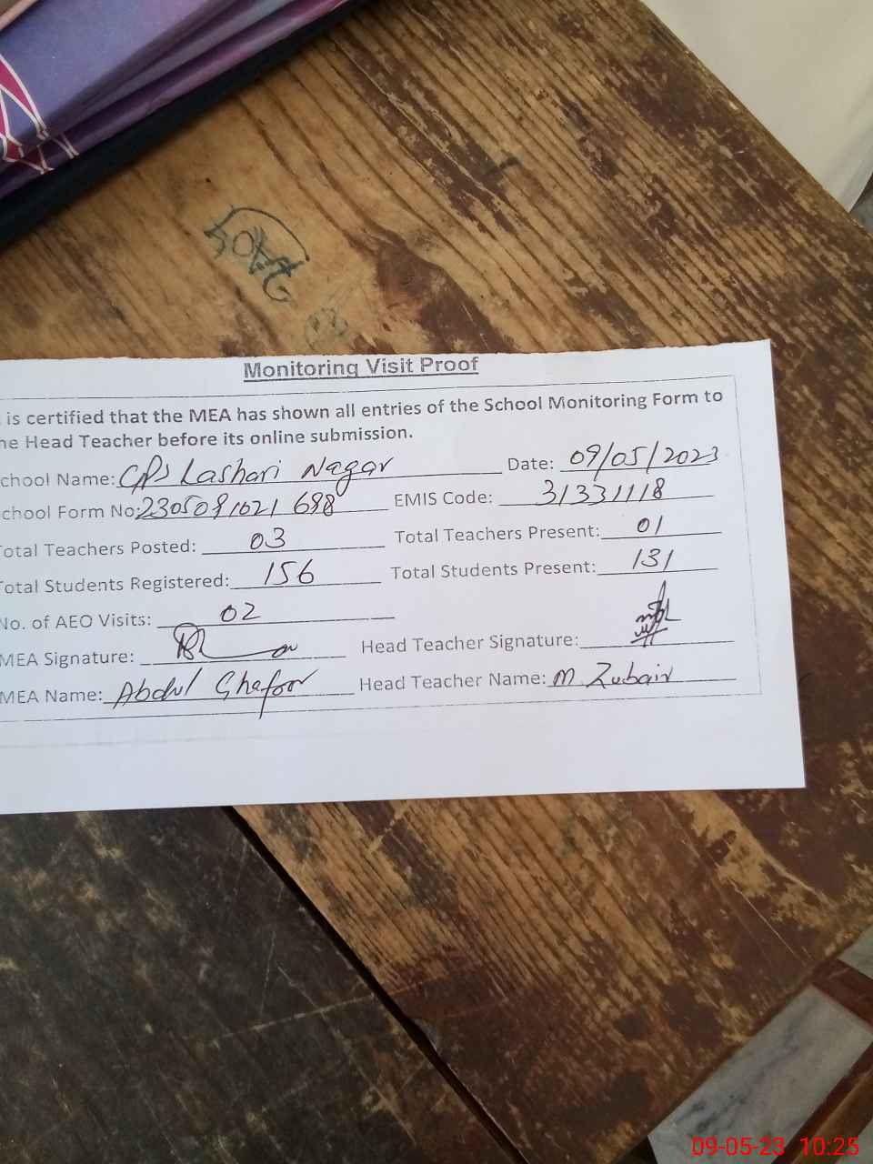 | Attendance Register | Head Teacher | MEA with School | Visit Proof |