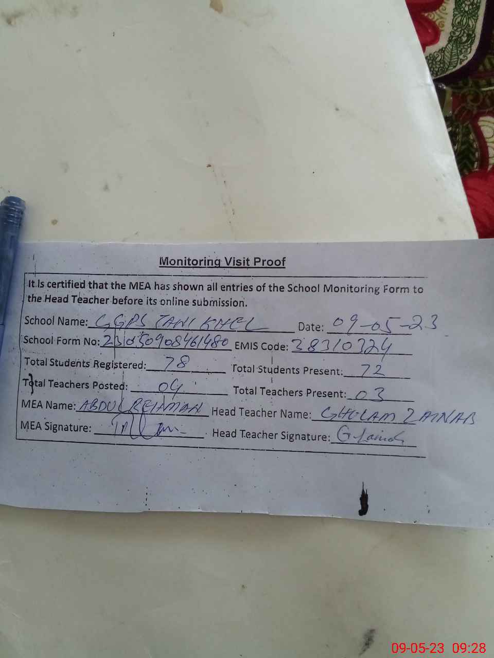 | Attendance Register | Head Teacher | MEA with School | Visit Proof |
