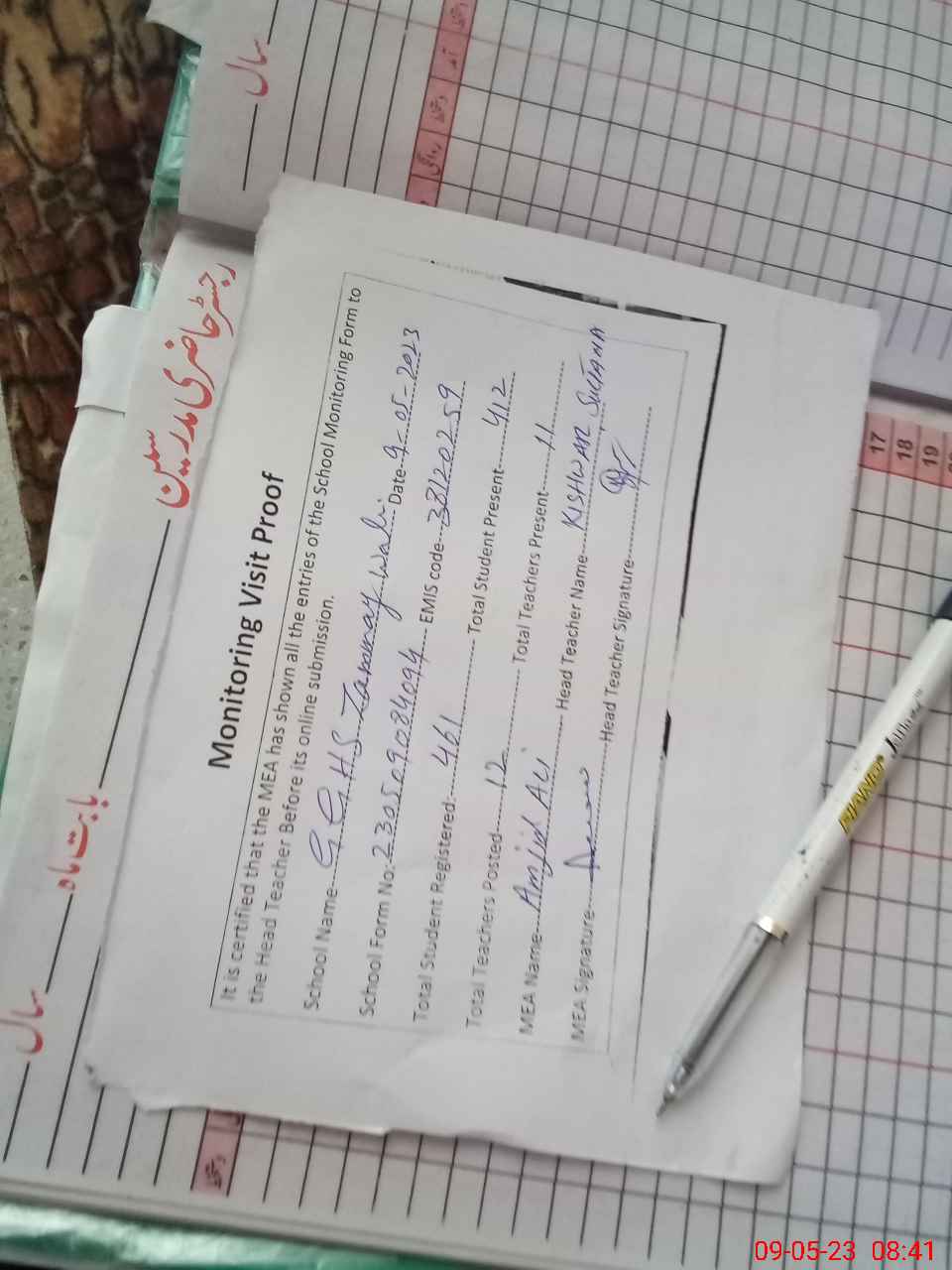 | Attendance Register | Head Teacher | MEA with School | Visit Proof |