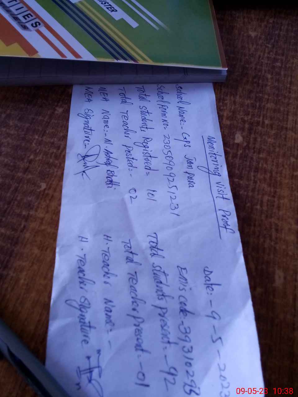| Attendance Register | Head Teacher | MEA with School | Visit Proof |