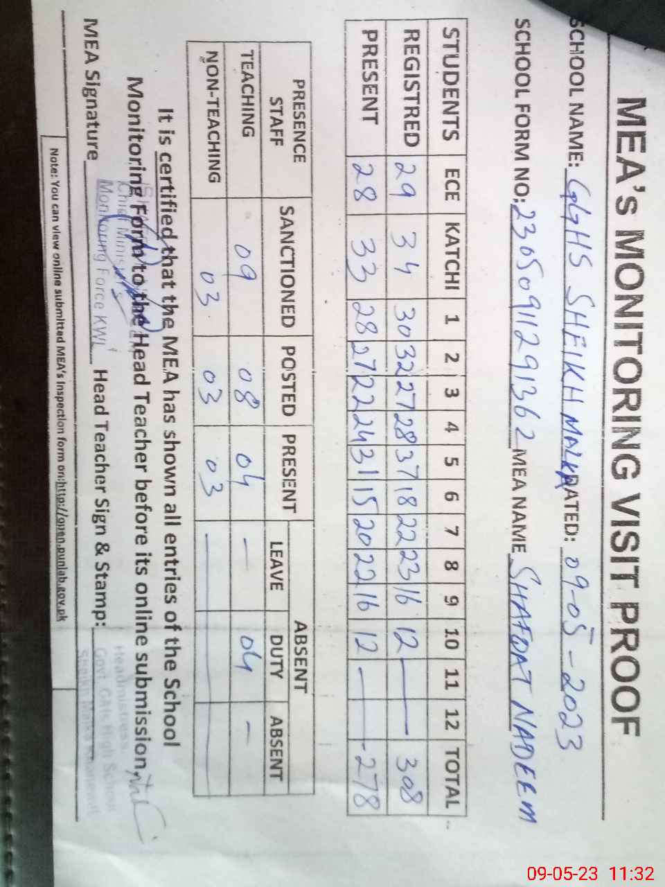 | Attendance Register | Head Teacher | MEA with School | Visit Proof |