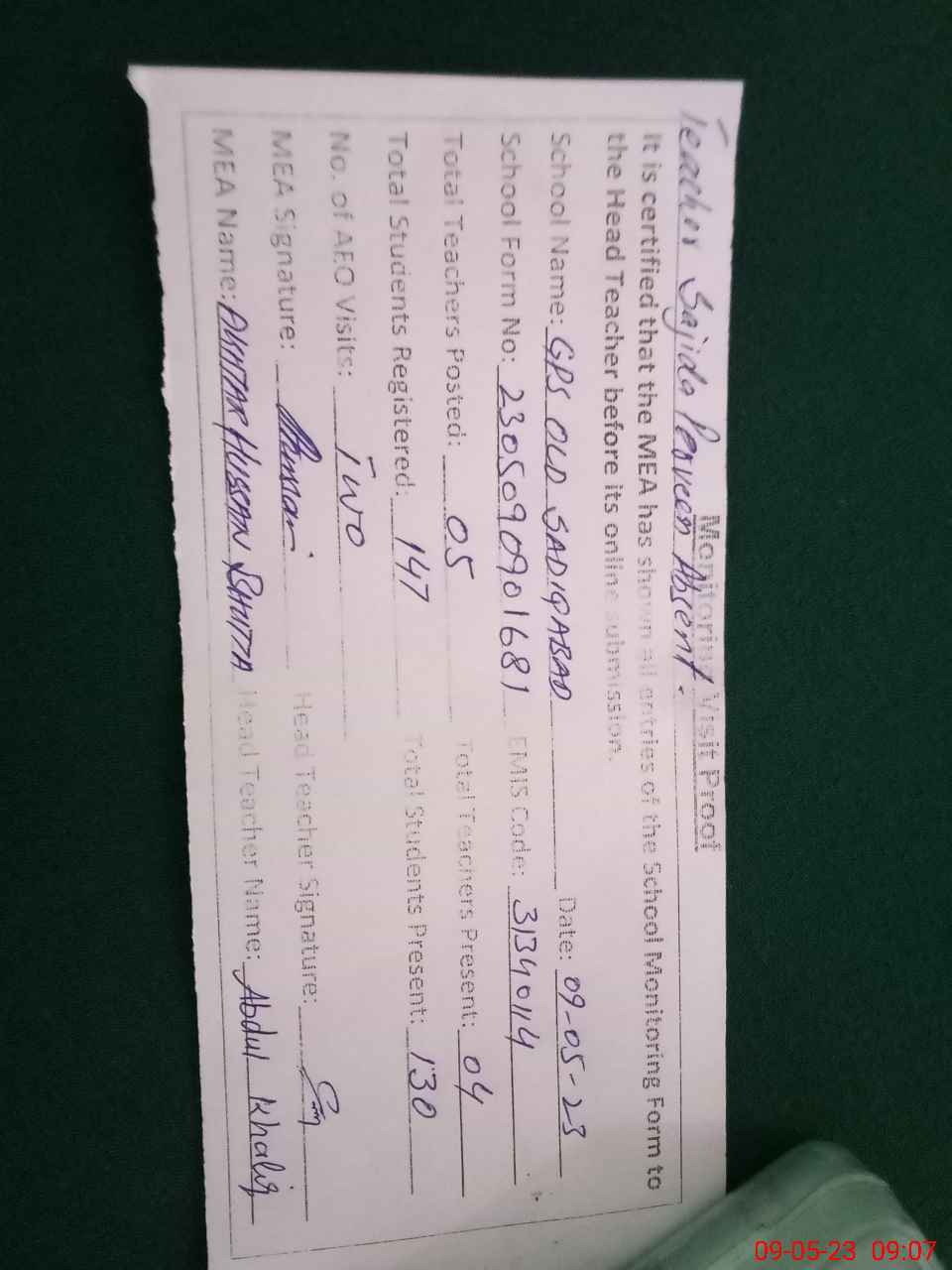 | Attendance Register | Head Teacher | MEA with School | Visit Proof |