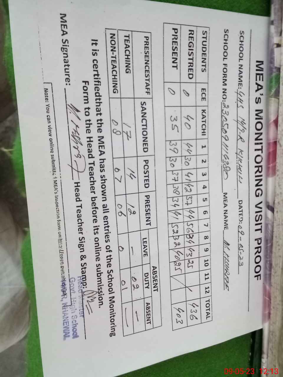 | Attendance Register | Head Teacher | MEA with School | Visit Proof |