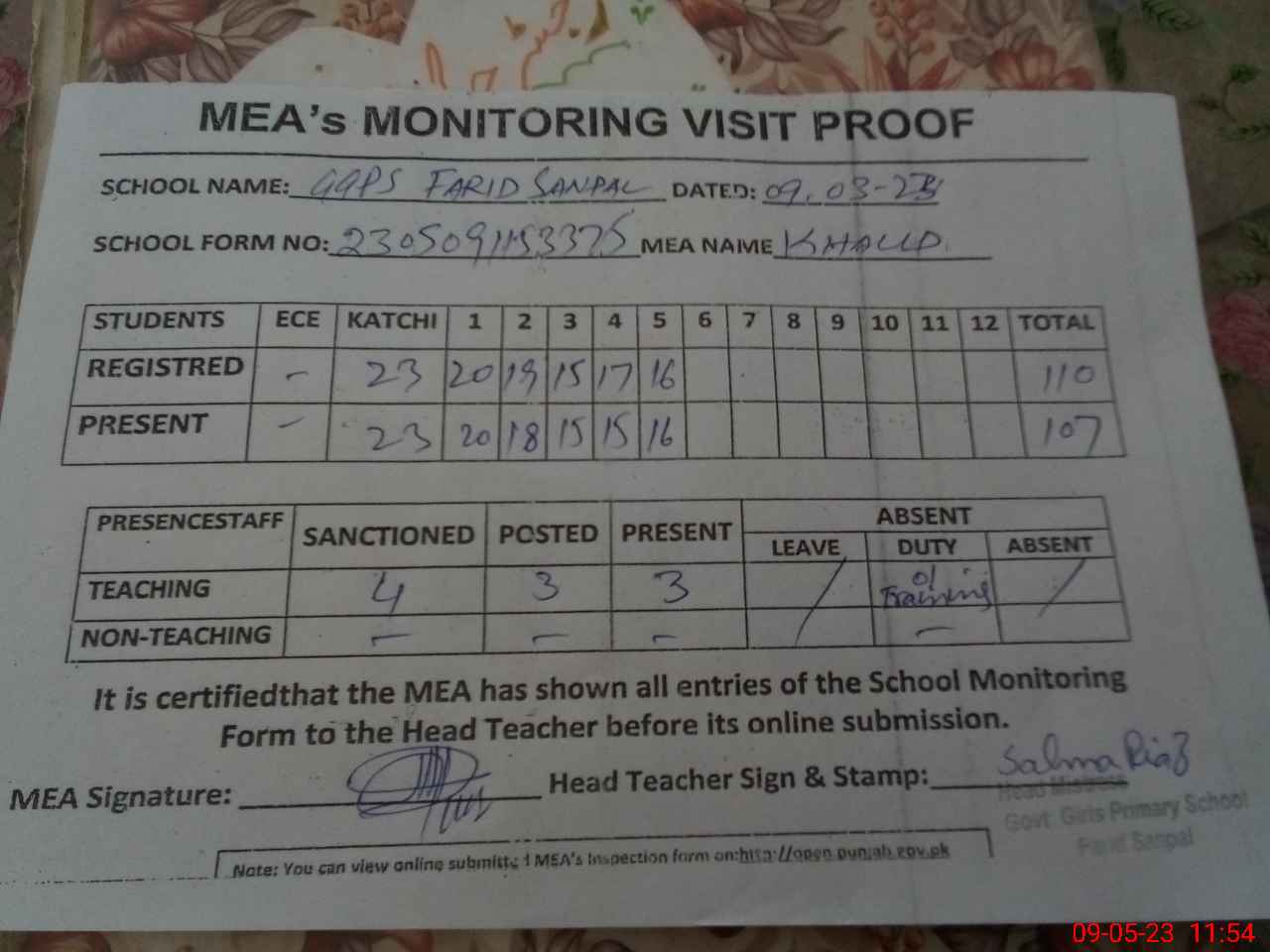 | Attendance Register | Head Teacher | MEA with School | Visit Proof |