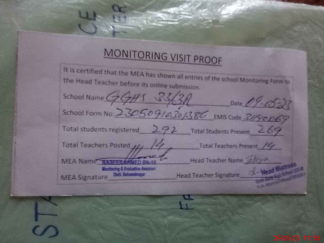 | Attendance Register | Head Teacher | MEA with School | Visit Proof |