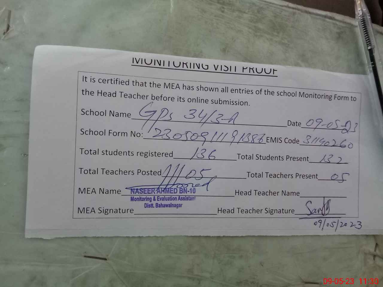 | Attendance Register | Head Teacher | MEA with School | Visit Proof |