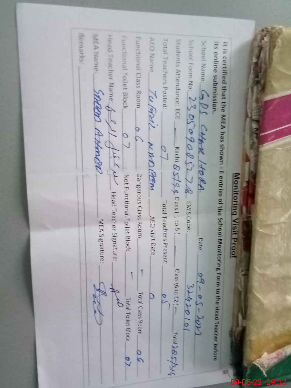 | Attendance Register | Head Teacher | MEA with School | Visit Proof |