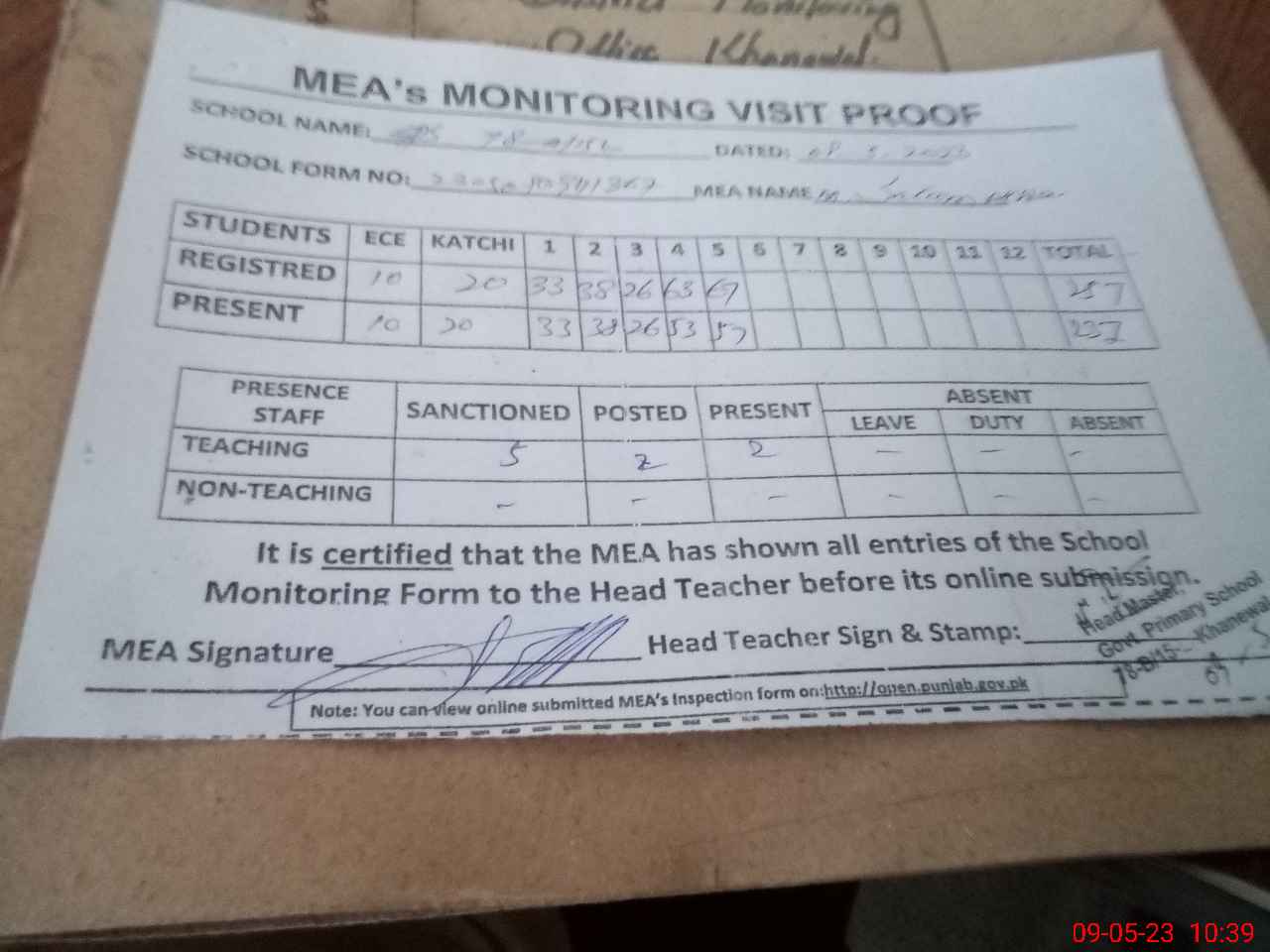 | Attendance Register | Head Teacher | MEA with School | Visit Proof |