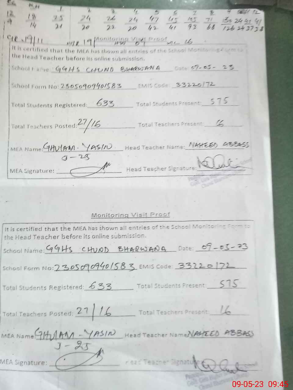 | Attendance Register | Head Teacher | MEA with School | Visit Proof |