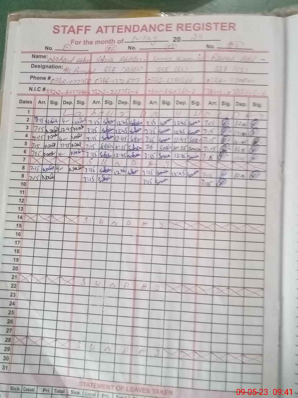 | CNIC | Full Name | Designation | R/C | Absence During Last Calender Month |