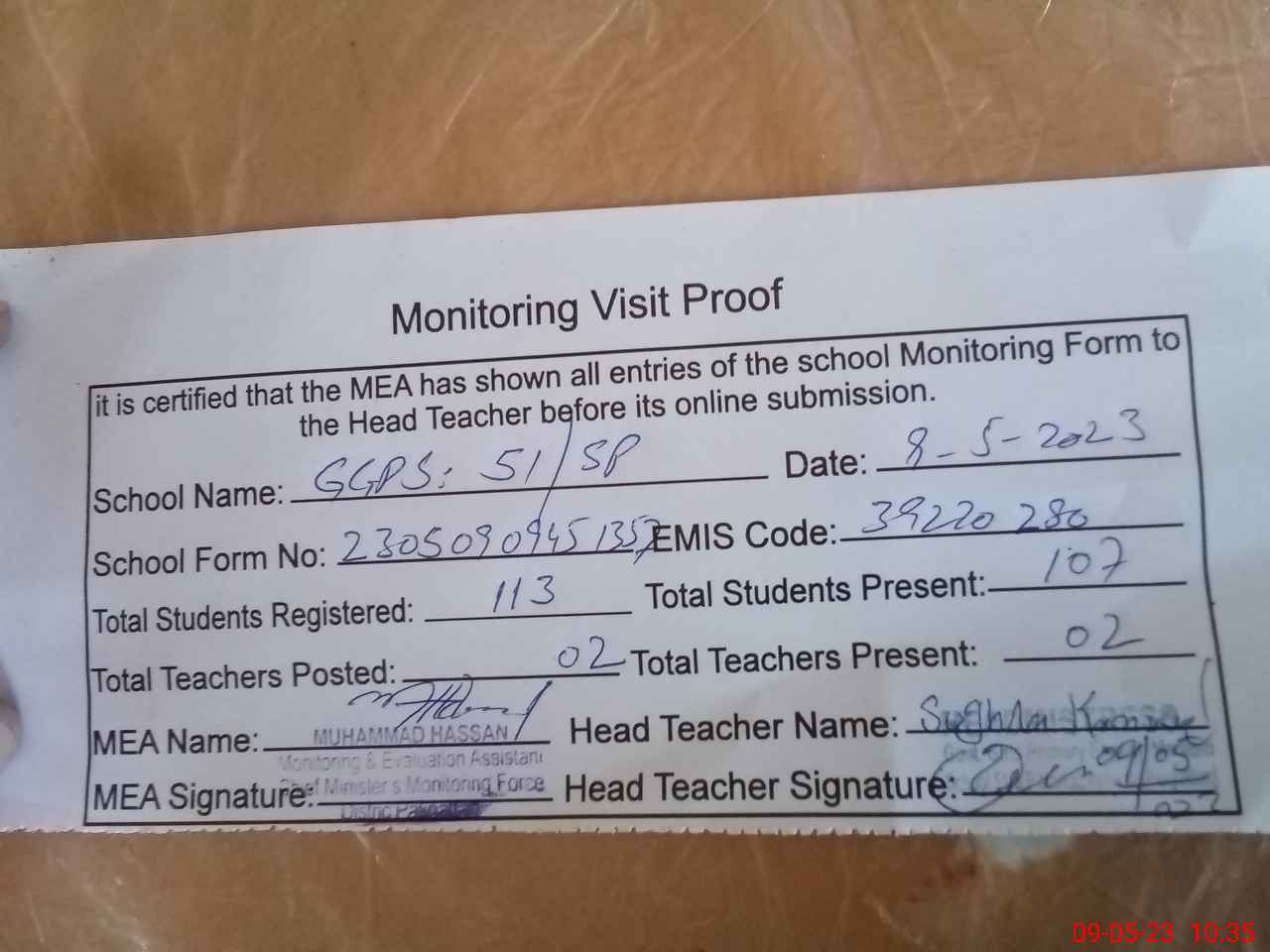 | EMIS Code: 39220280 | Name of School: GGPS 51 SP POST OFFICE JEVAN SHAH | |||